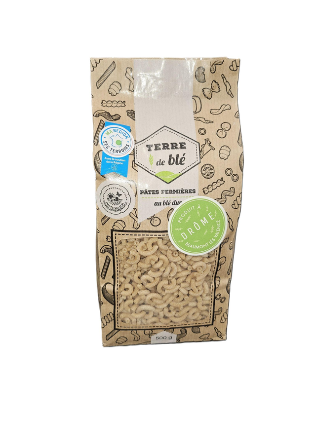 Coquillettes fermières transformées à la ferme à partir de BLÉ DUR cultivé sur notre exploitation.